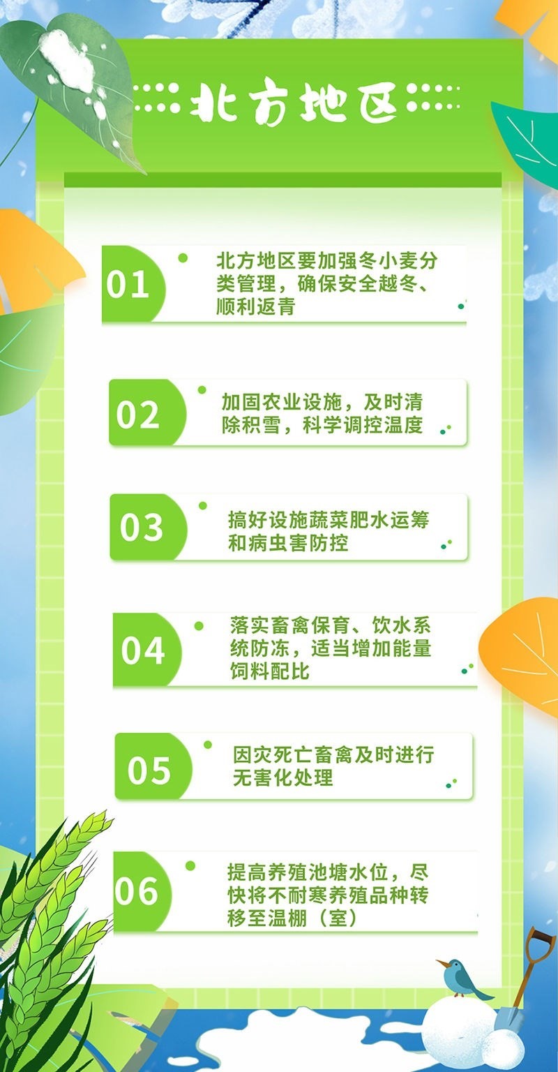 北方地區(qū)要加強(qiáng)冬小麥分類管理,確保安全越冬、順利返青;加固農(nóng)業(yè)設(shè)施,及時(shí)清除積雪,科學(xué)調(diào)控溫度;搞好設(shè)施蔬菜肥水運(yùn)籌和病蟲害防控;落實(shí)畜禽保育、飲水系統(tǒng)防凍,適當(dāng)增加能量飼料配比;因?yàn)?zāi)死亡畜禽及時(shí)進(jìn)行無害化處理;提高養(yǎng)殖池塘水位,盡快將不耐寒養(yǎng)殖品種轉(zhuǎn)移至溫棚(室)。