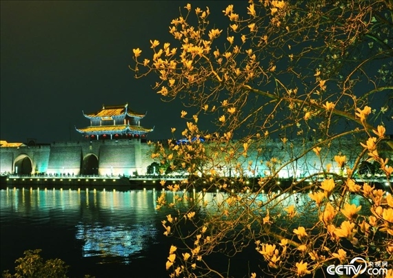 蘇州護城河畔,一株株含苞欲放的玉蘭花在燈光映照下璀璨奪目。