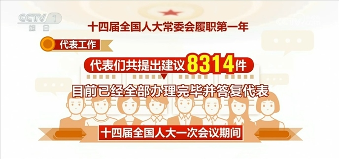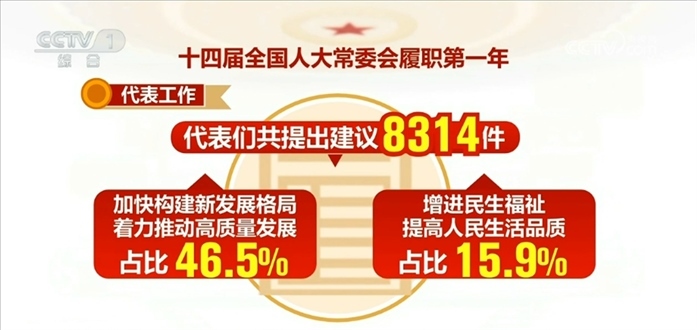 代表工作方面:十四屆全國(guó)人大一次會(huì)議期間,代表們共提出建議8314件,目前已經(jīng)全部辦理完畢并答復(fù)代表。其中,涉及加快構(gòu)建新發(fā)展格局、著力推動(dòng)高質(zhì)量發(fā)展的占比46.5%,涉及增進(jìn)民生福祉、提高人民生活品質(zhì)的占比15.9%。