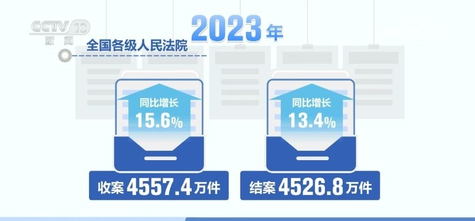 最高人民法院收案21081件,結(jié)案17855 件。同比分別增長54.6%、29.5%。全國各級人民法院收案4557.4萬件,結(jié)案4526.8萬件,同比分別增長15.6%、13.4%。