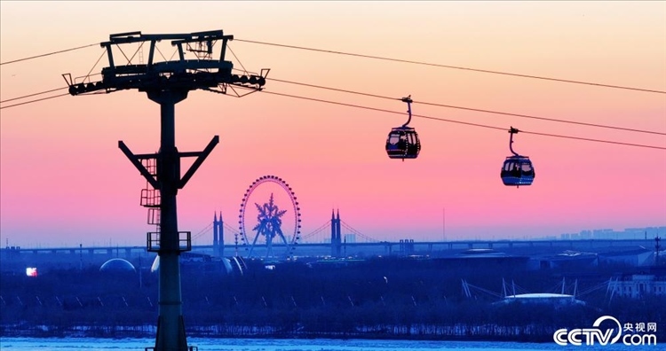 2024年3月8日,哈爾濱,松花江畔現(xiàn)絢麗晚霞,美景如畫。