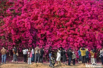 2024年3月8日,廣東惠州仲愷區(qū)潼湖鎮(zhèn)的一處古村落魚塘邊現(xiàn)百米長簕杜鵑花墻,吸引游客爭相拍照。