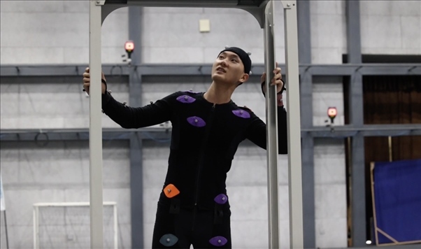 “這是動作數(shù)字孿生,利用光學(xué)動捕技術(shù),棚內(nèi)多個專業(yè)攝像頭捕捉演員身上的特定標記,以毫秒級的速率計算出角色的運動軌跡,然后將數(shù)據(jù)傳送到電腦上,實現(xiàn)虛擬人物的動作?!眹覄勇@公共技術(shù)服務(wù)平臺動捕棚的技術(shù)顧問崔盛輯向記者介紹道。