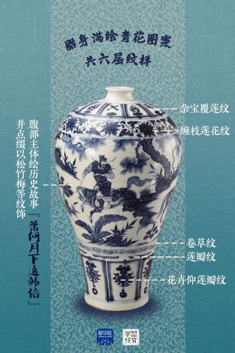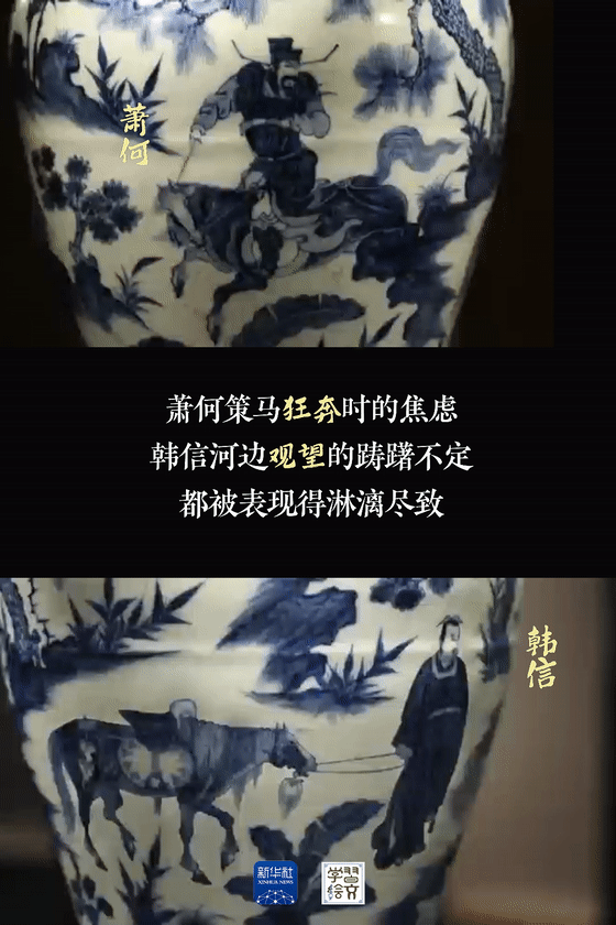 “元代是中國(guó)陶瓷史上不容忽視的重要時(shí)期。”宋燕介紹,這件藏于南京市博物館的元青花蕭何月下追韓信圖梅瓶向人們展示了元代制瓷水平。