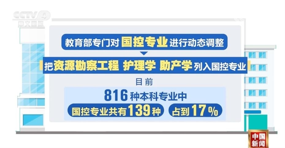 此次教育部專門對國控專業(yè)進(jìn)行了動態(tài)調(diào)整,把資源勘察工程、護(hù)理學(xué)、助產(chǎn)學(xué)列入了國控專業(yè)。目前,816種本科專業(yè)中,國控專業(yè)共有139種,占到17%。未來,國控專業(yè)范圍還將進(jìn)行“有進(jìn)有出”的動態(tài)調(diào)整。