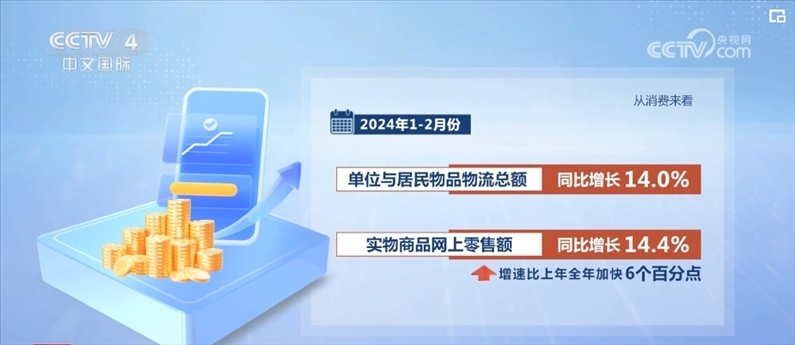 從消費(fèi)來看,1—2月份,單位與居民物品物流總額同比增長14.0%,實物商品網(wǎng)上零售額同比增長14.4%,增速比上年全年加快6個百分點(diǎn);快遞業(yè)務(wù)量超過230億件,同比增長28.5%,比上年全年加快9.1個百分點(diǎn)。