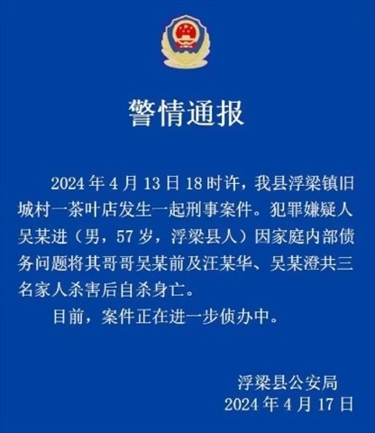 ·警方通報“知名茶企老板一家三口遇害案”:犯罪嫌疑人因家庭內(nèi)部債務(wù)問題將其哥哥吳某前等三名家人殺害后自殺身亡。