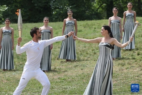 4月16日,第一棒火炬手——希臘運動員、東京奧運會男子賽艇項目金牌得主斯特凡諾斯·恩圖斯科斯(前左)從扮演最高女祭司的演員瑪麗·米娜手中接過橄欖枝。