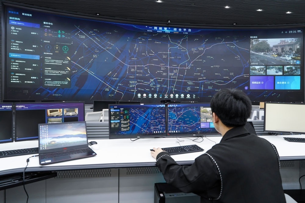 工作人員在江蘇省南京市城市運(yùn)行管理中心指揮大廳操作“一網(wǎng)統(tǒng)管”指揮調(diào)度系統(tǒng)(2024年4月11日攝)。近年來,南京市積極構(gòu)建數(shù)字化、智能化、智慧化城市治理體系,將城市運(yùn)行“一網(wǎng)統(tǒng)管”作為推進(jìn)城市數(shù)字化轉(zhuǎn)型、城市治理體系和治理能力現(xiàn)代化的重要工作。