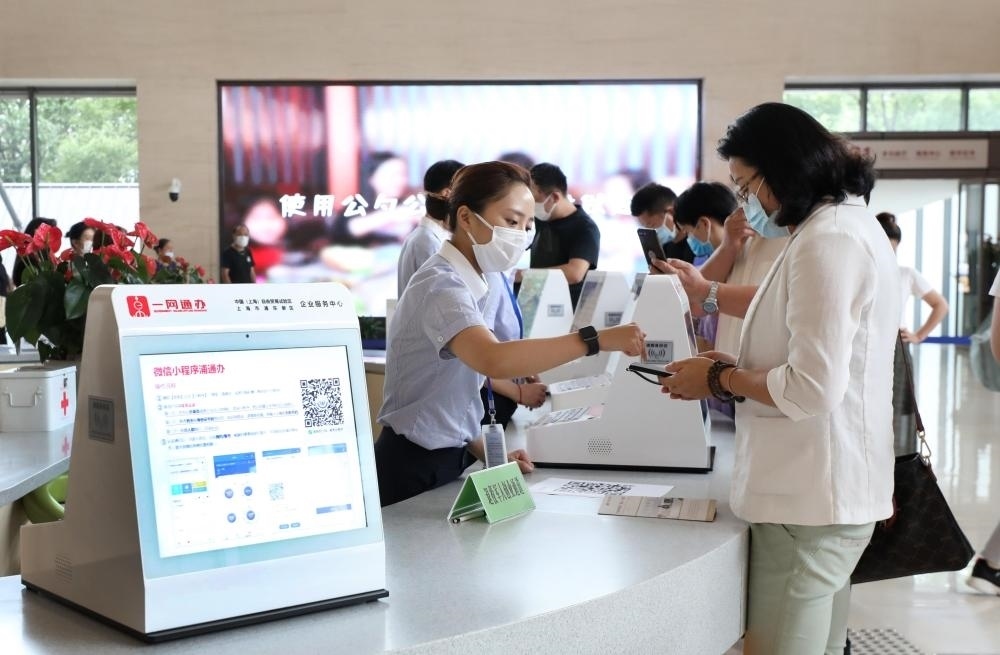 上海市浦東新區(qū)2019年率先啟動“一業(yè)一證”改革。這是在浦東新區(qū)企業(yè)服務(wù)中心辦事大廳,工作人員指導(dǎo)市民通過手機(jī)小程序辦理一網(wǎng)通辦業(yè)務(wù)(2020年8月4日攝)。