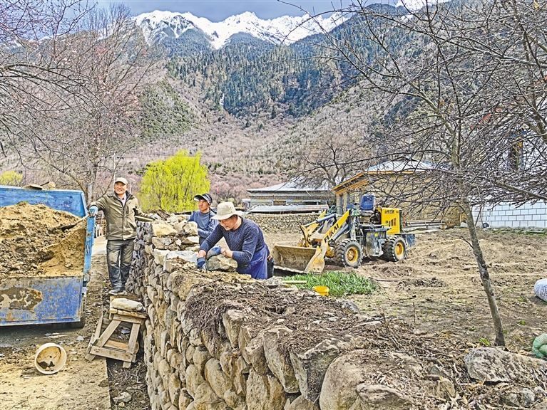 圖為村民強巴一家在給果園砌圍墻。