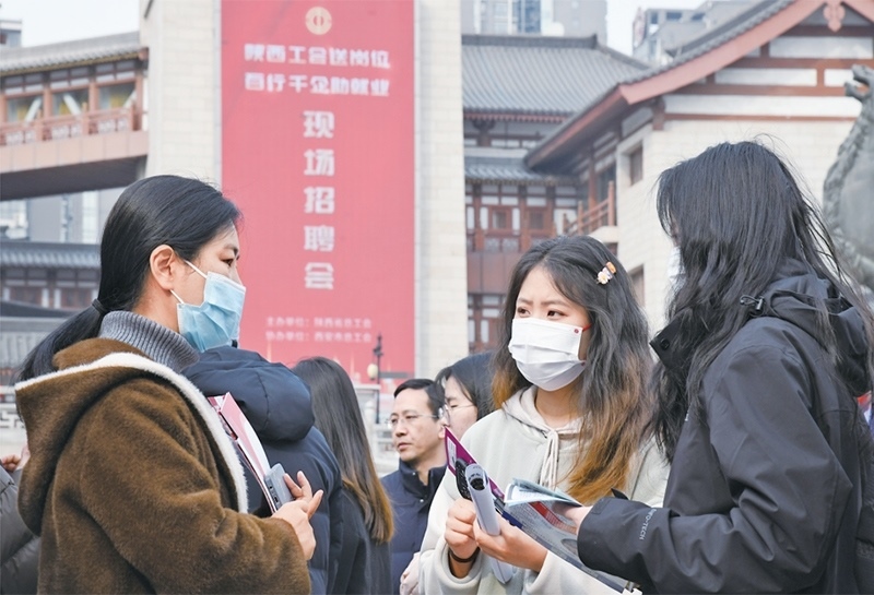 2024年3月6日,由陜西省總工會舉辦的2024年陜西工會“春送崗位”就業(yè)服務(wù)月啟動儀式在西安舉行。與啟動儀式同期舉辦的現(xiàn)場招聘會吸引約200家用人單位參加,提供崗位超過5000個。圖為當(dāng)日求職者在現(xiàn)場招聘會上與企業(yè)工作人員交流。 新華社記者 張博文/攝