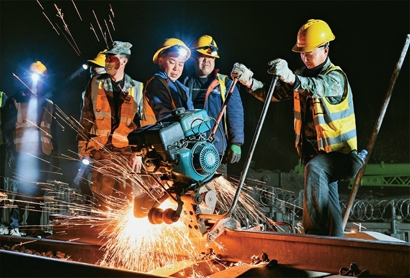 2024年4月10日,在內(nèi)蒙古包頭市,包銀高鐵引入包頭樞紐工程的關(guān)鍵控制性工程之一——包西上行線路撥接完成施工。此次施工完成,標(biāo)志著包銀高鐵引入包頭樞紐包頭站改造工程取得重大進(jìn)展,為包銀高鐵開通奠定堅實(shí)基礎(chǔ)。圖為4月10日凌晨,工人在包西上行線路上作業(yè)。 新華社記者 劉磊/攝