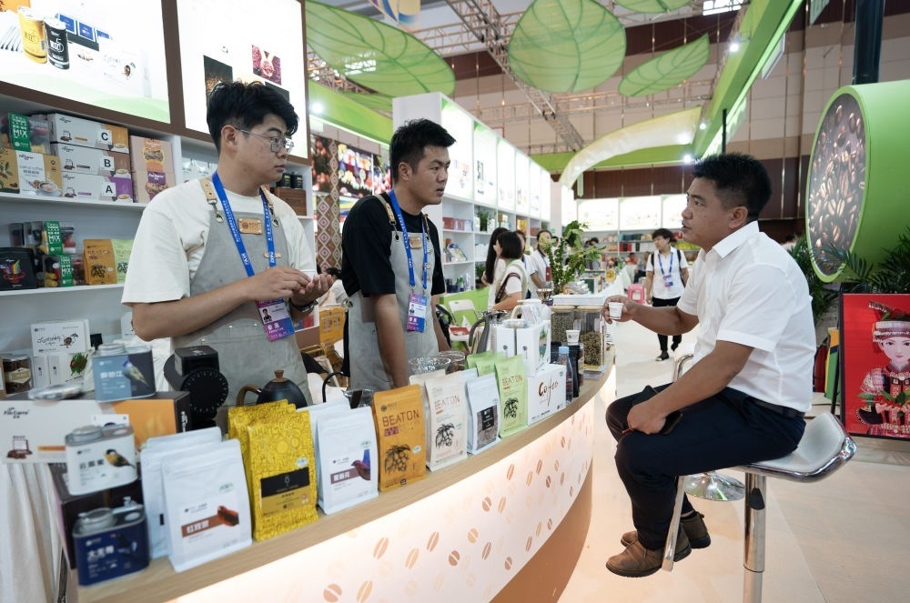 來(lái)自云南保山的參展商在第七屆中國(guó)—南亞博覽會(huì)上向參觀者介紹咖啡產(chǎn)品(2023年8月16日攝)。新華社記者 陳欣波 攝