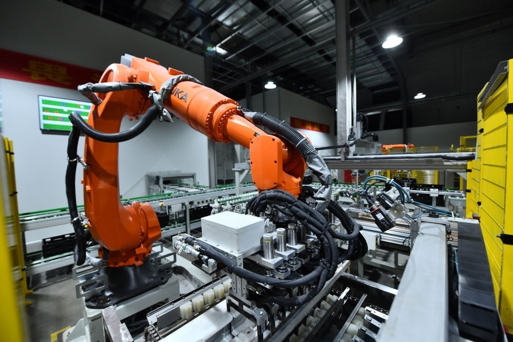 在廣西柳州市一家新能源汽車電池生產(chǎn)企業(yè),機(jī)器人在生產(chǎn)線上作業(yè)(2023年5月10日攝)。新華社記者 黃孝邦 攝