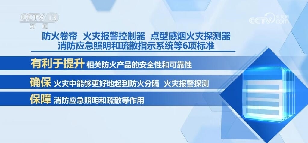 防火卷簾、火災報警控制器、點型感煙火災探測器、消防應急照明和疏散指示系統(tǒng)等6項標準有利于提升相關防火產(chǎn)品的安全性和可靠性,確保其在火災中能夠更好地起到防火分隔、火災報警探測,保障消防應急照明和疏散等作用。應急避難場所、救災帳篷等4項標準可確保受災人員得到更安全、更舒適的臨時安置。