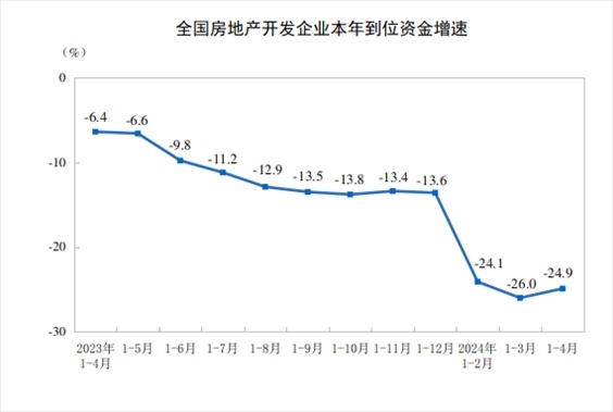 1—4月份,房地產開發(fā)企業(yè)到位資金34036億元,同比下降24.9%。其中,國內貸款5583億元,下降10.1%;利用外資9億元,下降46.7%;自籌資金11736億元,下降10.1%;定金及預收款10002億元,下降37.2%;個人按揭貸款4953億元,下降39.7%。