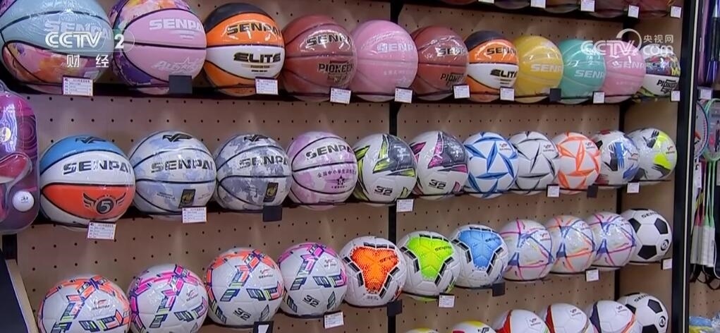 這里是義烏國際商貿(mào)城三區(qū),擺滿了各種體育用品。記者了解到,最近籃球、足球、排球等體育用品訂單猛漲。