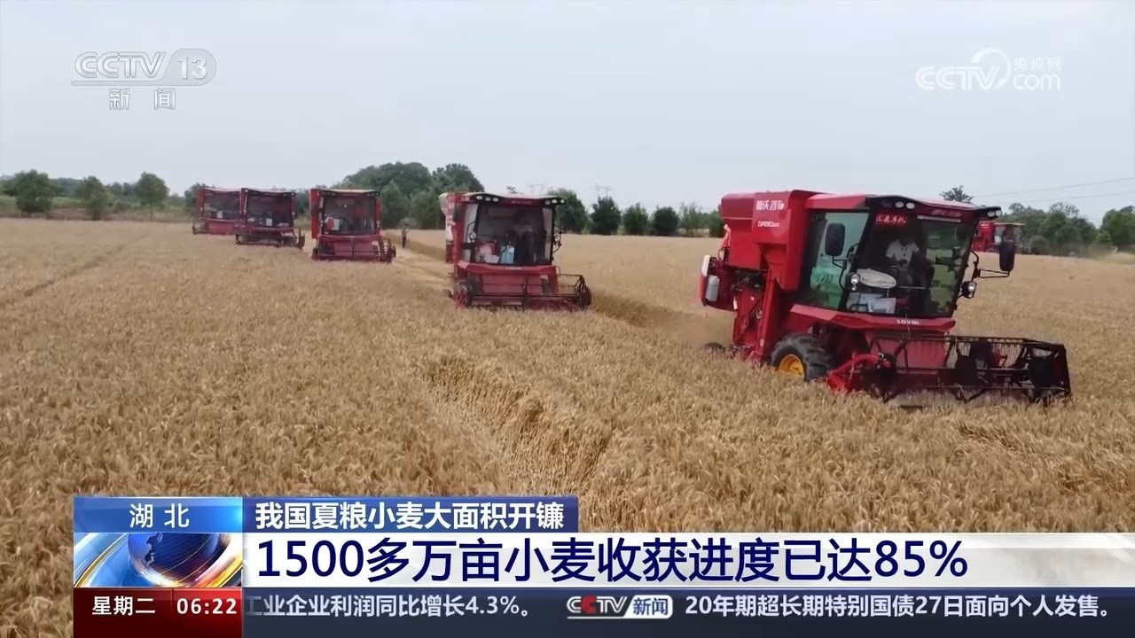 記者從湖北省農(nóng)業(yè)農(nóng)村廳了解到,截至5月26日,湖北省1500多萬畝小麥收獲進度達85%。