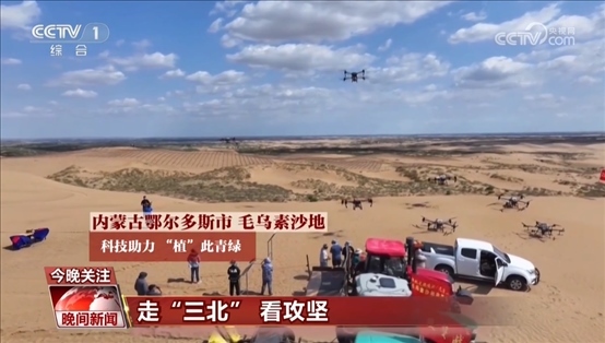央視網(wǎng)消息:在內(nèi)蒙古毛烏素沙地,無人機飛播、機器人栽種正當時,科技助力“植”此青綠。