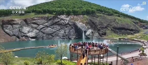 在黑龍江雙鴨山的翡翠湖礦坑公園,藍(lán)綠色湖水在陽光照耀下如詩如畫。游客們身處山野間,感受著自然之美和夏日清涼。