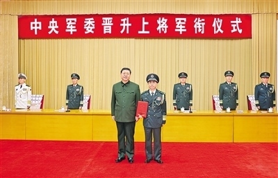 下午4時(shí)許,晉銜儀式在莊嚴(yán)的中華人民共和國國歌聲中開始。中央軍委副主席張又俠宣讀了中央軍委主席習(xí)近平簽署的晉升上將軍銜命令。中央軍委副主席何衛(wèi)東主持晉銜儀式。