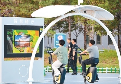 | 在內(nèi)蒙古自治區(qū)鄂爾多斯市康巴什區(qū)智慧體育公園,市民使用智慧騎行器械健身。王 正攝(人民視覺) |