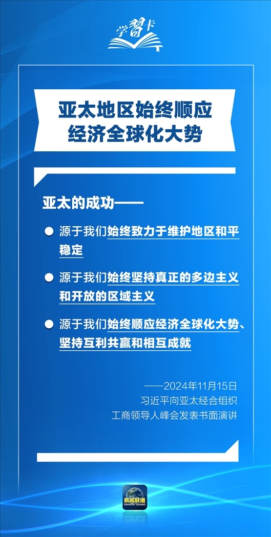 習(xí)近平指出,過去30年,亞太地區(qū)經(jīng)濟保持了強勁增長,創(chuàng)造了舉世矚目的“亞太奇跡”。如何推動構(gòu)建亞太命運共同體,打造亞太發(fā)展的下一個“黃金三十年”?習(xí)主席強調(diào)了一個關(guān)鍵詞:經(jīng)濟全球化。一起學(xué)習(xí)↓