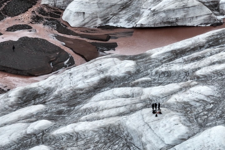 2024年7月25日,在青海省三江源區(qū)冬克瑪?shù)妆ǎ淳C合科學(xué)考察隊(duì)員在探測(cè)冰川。新華社記者 伍志尊 攝