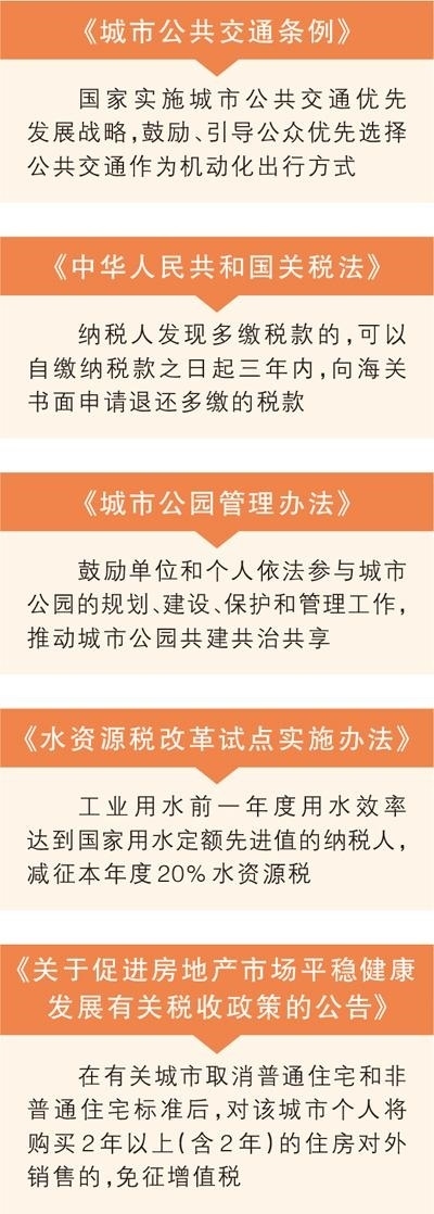 編者按:鼓勵、引導公眾優(yōu)先選擇公共交通作為機動化出行方式;保持現(xiàn)行關稅稅制基本穩(wěn)定;鼓勵單位和個人參與城市公園的規(guī)劃、建設、管理……12月起,《城市公共交通條例》《中華人民共和國關稅法》《城市公園管理辦法》等一批法律法規(guī)正式施行,切實以法治力量推動經(jīng)濟社會高質量發(fā)展。