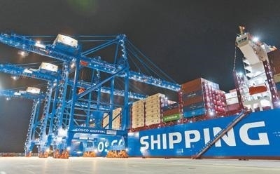 軟聯(lián)通共建“一帶一路”國家在工作制度對接、技術(shù)標(biāo)準(zhǔn)協(xié)調(diào)、檢驗(yàn)結(jié)果互認(rèn)等方面強(qiáng)化合作、統(tǒng)一標(biāo)準(zhǔn),貿(mào)易自由化便利化水平不斷提升。上海洋山港海關(guān)對接共建國家進(jìn)出口貨物相關(guān)標(biāo)準(zhǔn),推動通關(guān)一體化方式申報(bào),提升通關(guān)效率。圖為無人駕駛的全自動導(dǎo)引車在洋山港穿梭往來,搬運(yùn)集裝箱。王 初攝(影像中國)