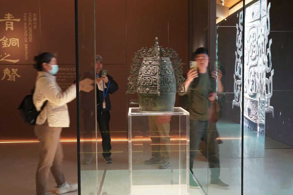 △2月26日,游客在西部機(jī)場(chǎng)博物館珍寶館內(nèi)參觀國(guó)家一級(jí)文物“秦公镈”。