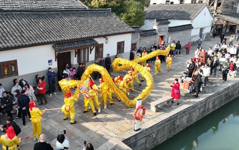 △2月10日,浙江湖州市德清縣新市古鎮(zhèn)舞龍表演。
