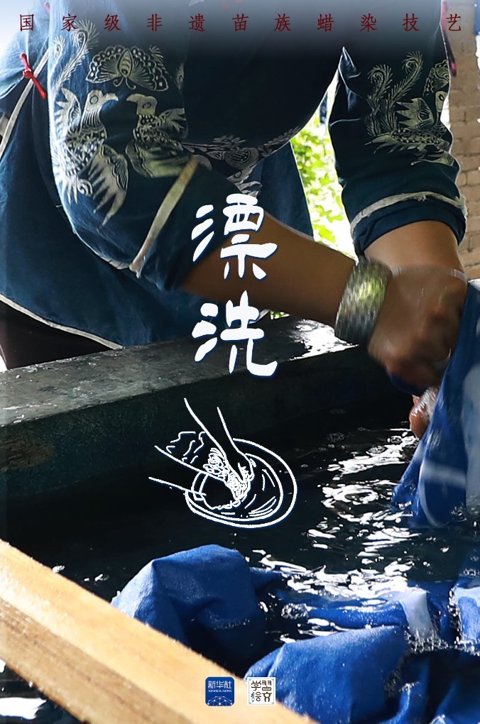 染色,就是將畫好圖案的土布,放入藍靛染缸中,反復浸泡多次,確保其上色。其間,作為防染劑的蠟自然龜裂,使布面呈現特殊的“冰紋”,具有獨特魅力。