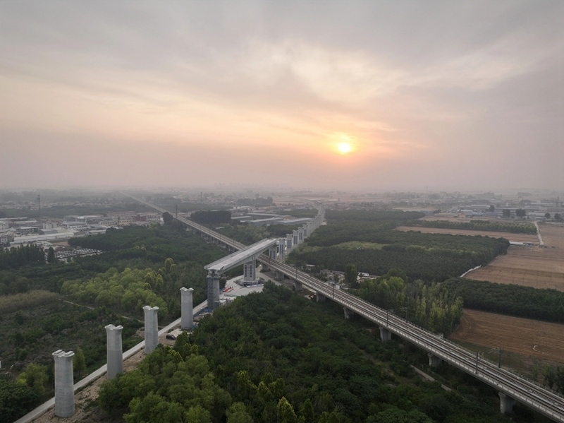 轉體完成的雄忻高鐵雄保段跨京廣高鐵轉體橋(6月18日攝,無人機照片)。
