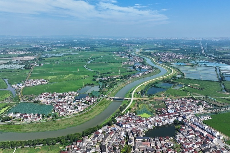 9月15日拍攝的句容赤山湖及周邊農(nóng)田(無人機全景照片)。
