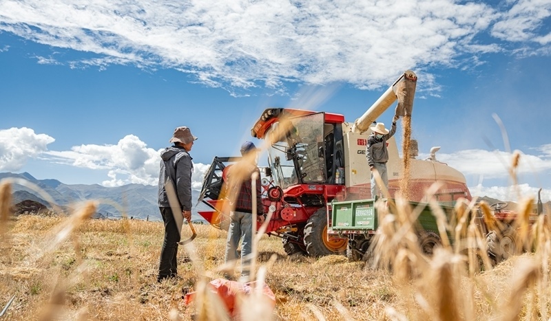 9月23日,在西藏拉薩市林周縣松盤(pán)鄉(xiāng)崗巴村,農(nóng)民用收割機(jī)收獲青稞。