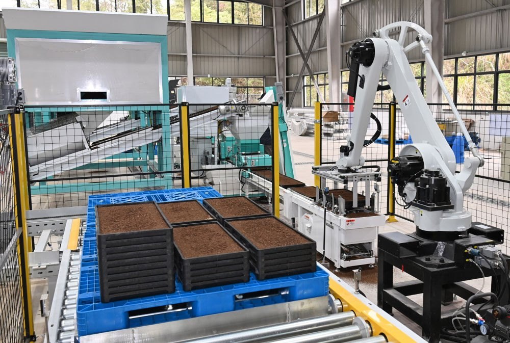 在浙江省東陽市皇野生態(tài)農業(yè)有限公司現(xiàn)代農事服務中心,全自動智能水稻育秧生產(chǎn)線在制作秧盤(2025年3月13日攝)。新華社發(fā)(包康軒 攝)