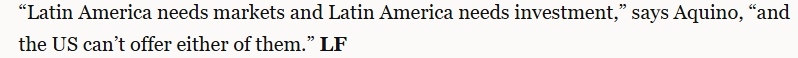 文章指出,并非所有人都對(duì)拉美與中國(guó)之間的合作感到滿(mǎn)意。華盛頓尤其擔(dān)心。不過(guò),許多人認(rèn)為華盛頓影響拉丁美洲的能力有限。文章援引利馬國(guó)立圣馬科斯大學(xué)的亞洲經(jīng)濟(jì)專(zhuān)家卡洛斯·阿基諾的話(huà)指出,“拉丁美洲需要市場(chǎng)和投資,但美國(guó)無(wú)法提供其中任何一項(xiàng)”。