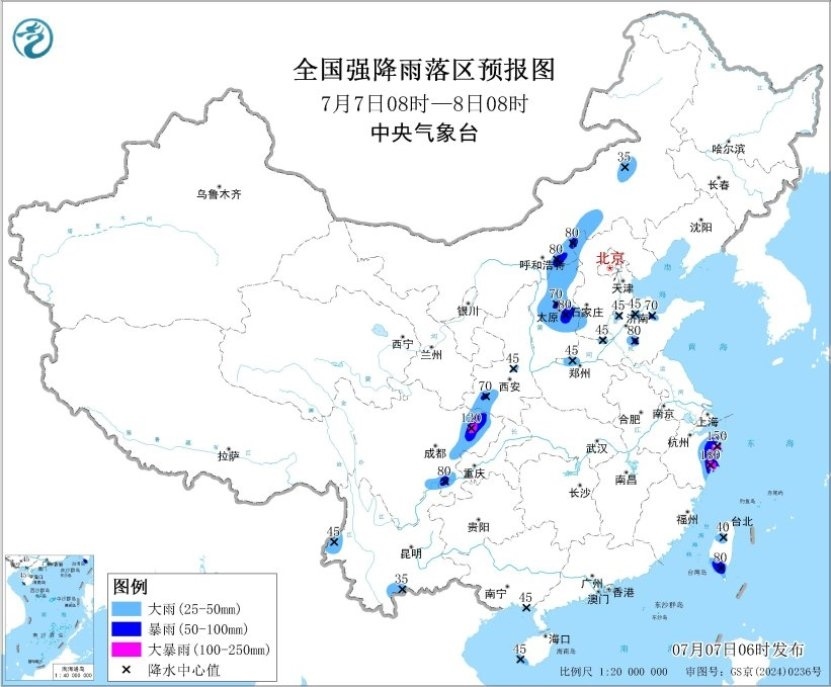 預(yù)計,7月7日08時至8日08時,浙江東部、內(nèi)蒙古中部、山西中北部、河北西北部和西南部、山東北部、河南西北部、陜西西南部、四川東部、云南西南部、臺灣島等地部分地區(qū)有大到暴雨,其中,浙江東部、四川東部等地部分地區(qū)有大暴雨(100~180毫米)。上述部分地區(qū)伴有短時強(qiáng)降水(最大小時降雨量20~50毫米,局地可超過70毫米),局地有雷暴大風(fēng)等強(qiáng)對流天氣。中央氣象臺7月7日06時繼續(xù)發(fā)布暴雨藍(lán)色預(yù)警。