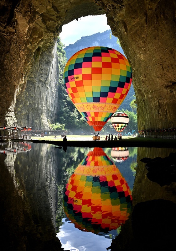7月10日,游客在利川市騰龍洞的洞口處乘坐熱氣球。