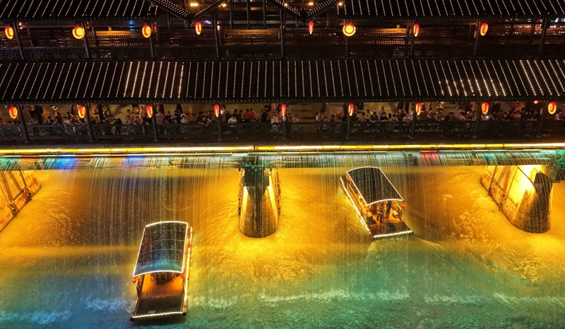 7月10日,游客在利川市騰龍洞的洞穴內(nèi)觀看實景劇《夷水麗川》。