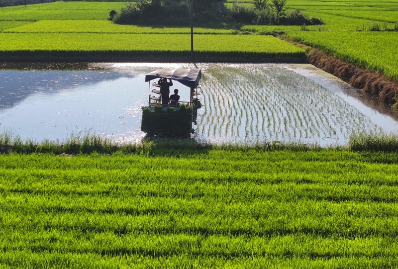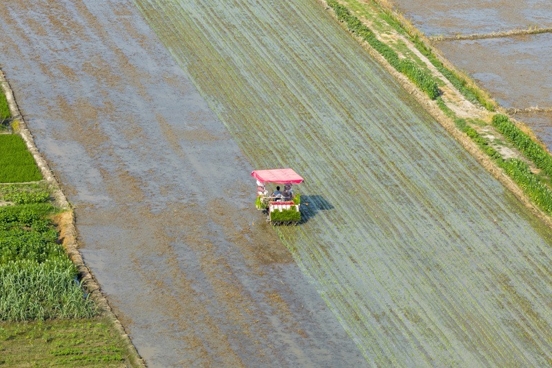7月15日,在湖南省衡陽(yáng)市衡山縣福田鋪鄉(xiāng),村民駕駛農(nóng)機(jī)進(jìn)行晚稻插秧工作(無(wú)人機(jī)照片)。
