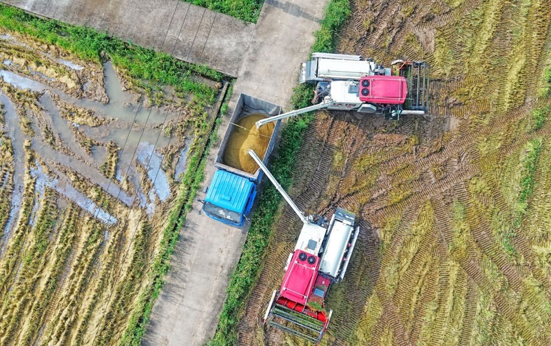 7月15日,在浙江省臺(tái)州市仙居縣下各鎮(zhèn),農(nóng)民將剛收割的稻谷裝車(無(wú)人機(jī)照片)。