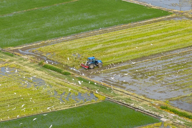 7月14日,在浙江省余姚市黃家埠鎮(zhèn)五車堰村,農(nóng)民駕駛農(nóng)機(jī)翻耕農(nóng)田(無(wú)人機(jī)照片)。