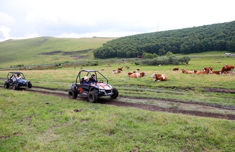 7月24日,游客在內(nèi)蒙古自治區(qū)赤峰市克什克騰旗草原駕乘草地車。