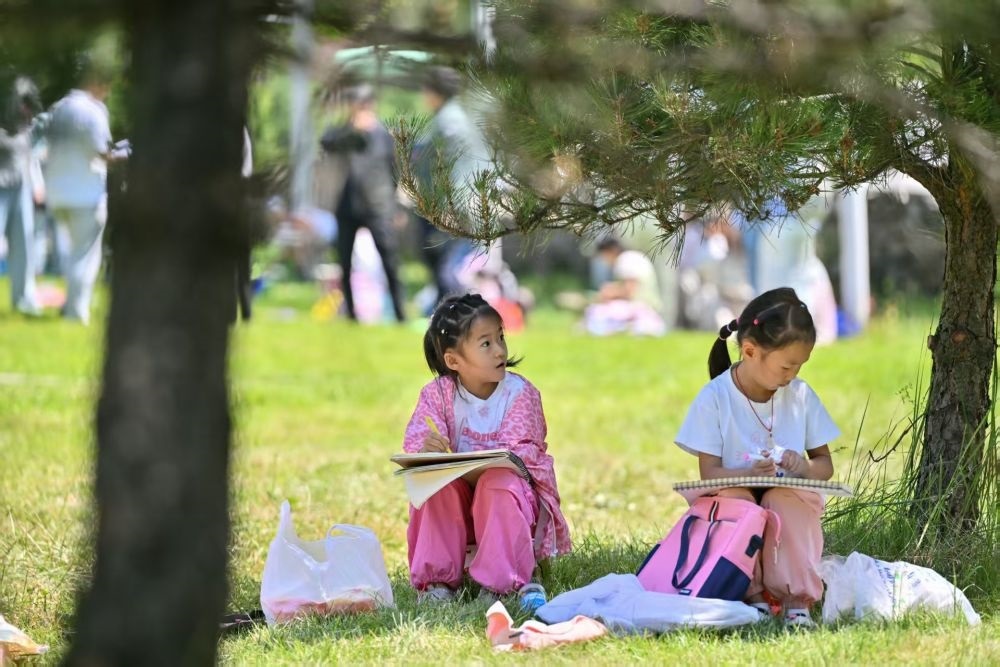 7月22日,兩名小學生在青海省大通縣邊麻溝花海景區(qū)內參加暑期美術寫生研學活動。新華社記者 孫瑞博 攝