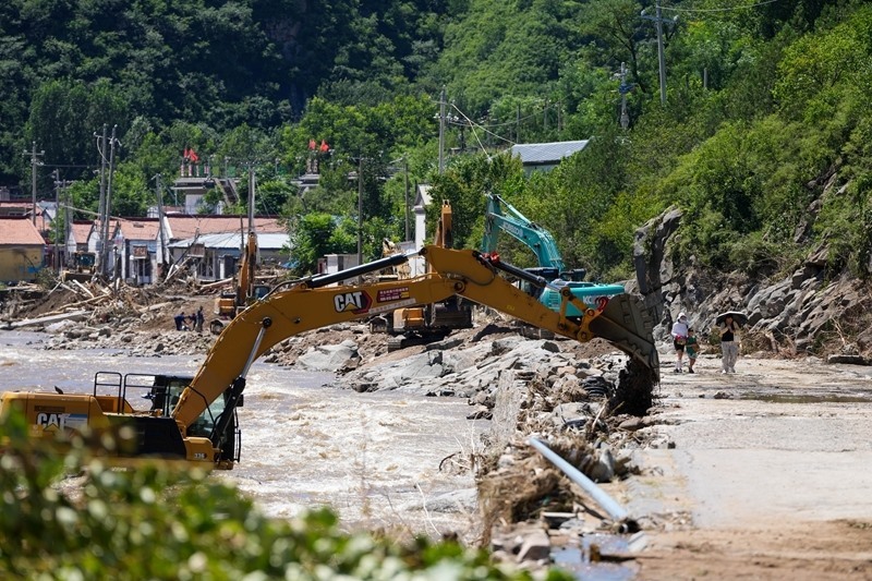 7月30日,在北京市密云區(qū)馮家峪鎮(zhèn),道路搶修人員整修道路。