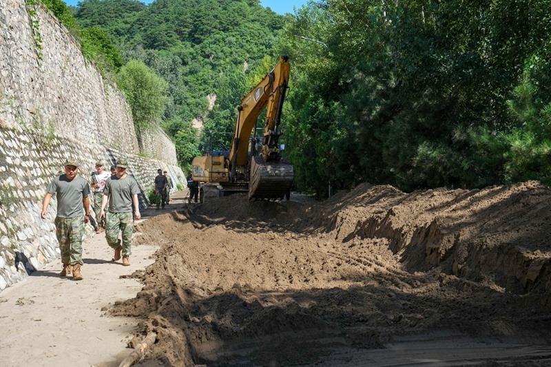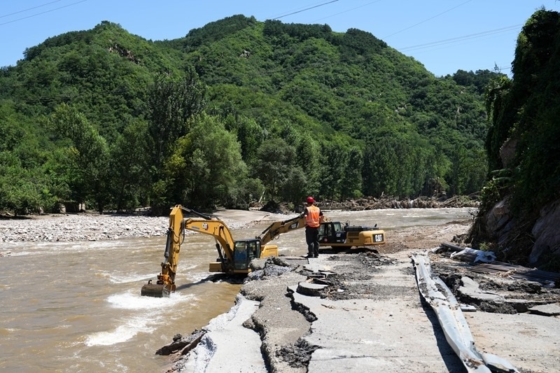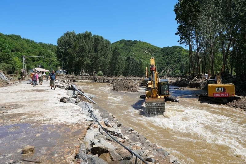 7月30日,在北京市密云區(qū)馮家峪鎮(zhèn),道路搶修人員恢復(fù)被洪水沖斷的道路。