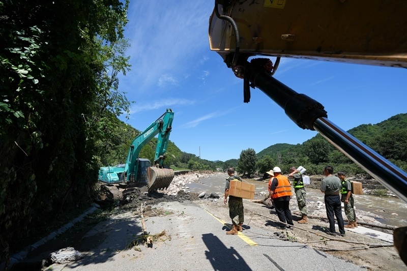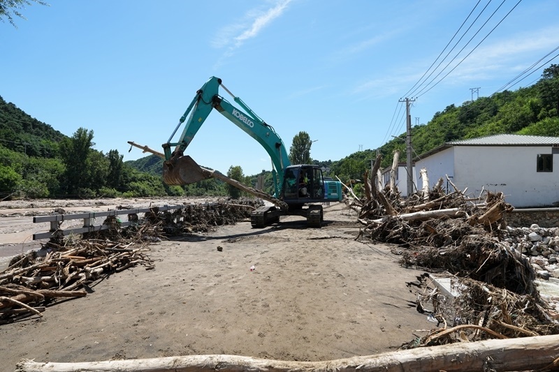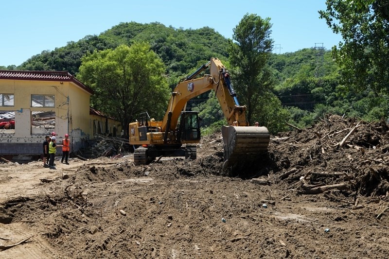 7月30日,在北京市密云區(qū)馮家峪鎮(zhèn),道路搶修人員清理道路上的雜物。